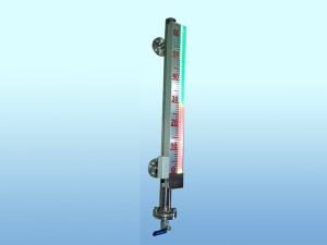 非磁性传感器管经过上下法兰与液体容器连通,在传感器管内装有一个磁性浮子,浮子根据介质的比重设计,浮子内磁钢与容器内液面等高,液位显现盒内感磁部件和LED双色发光管上下有序摆放,与磁场相对应的感磁部件受磁后,触发相应的电路,无水全红,满水全绿;赤色显现汽相,绿色显现液相,红绿交界处便是容器内的实际液位,液绿汽红,一目了然。